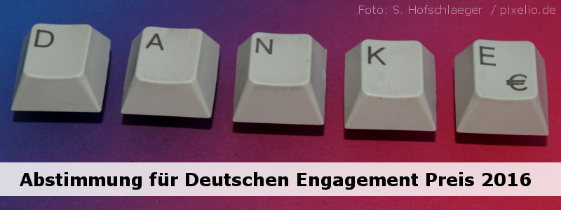 Über 30 Millionen Menschen in Deutschland sind bürgerschaftlich engagiert. Dieses beeindruckende Engagement verdient unsere Anerkennung und Wertschätzung. Ich rufe die Bürgerinnen und Bürger meines Wahlkreises auf, sich an der Abstimmung für den Publikumspreis „Deutscher Engagement Preis 2016“ zu beteiligen.